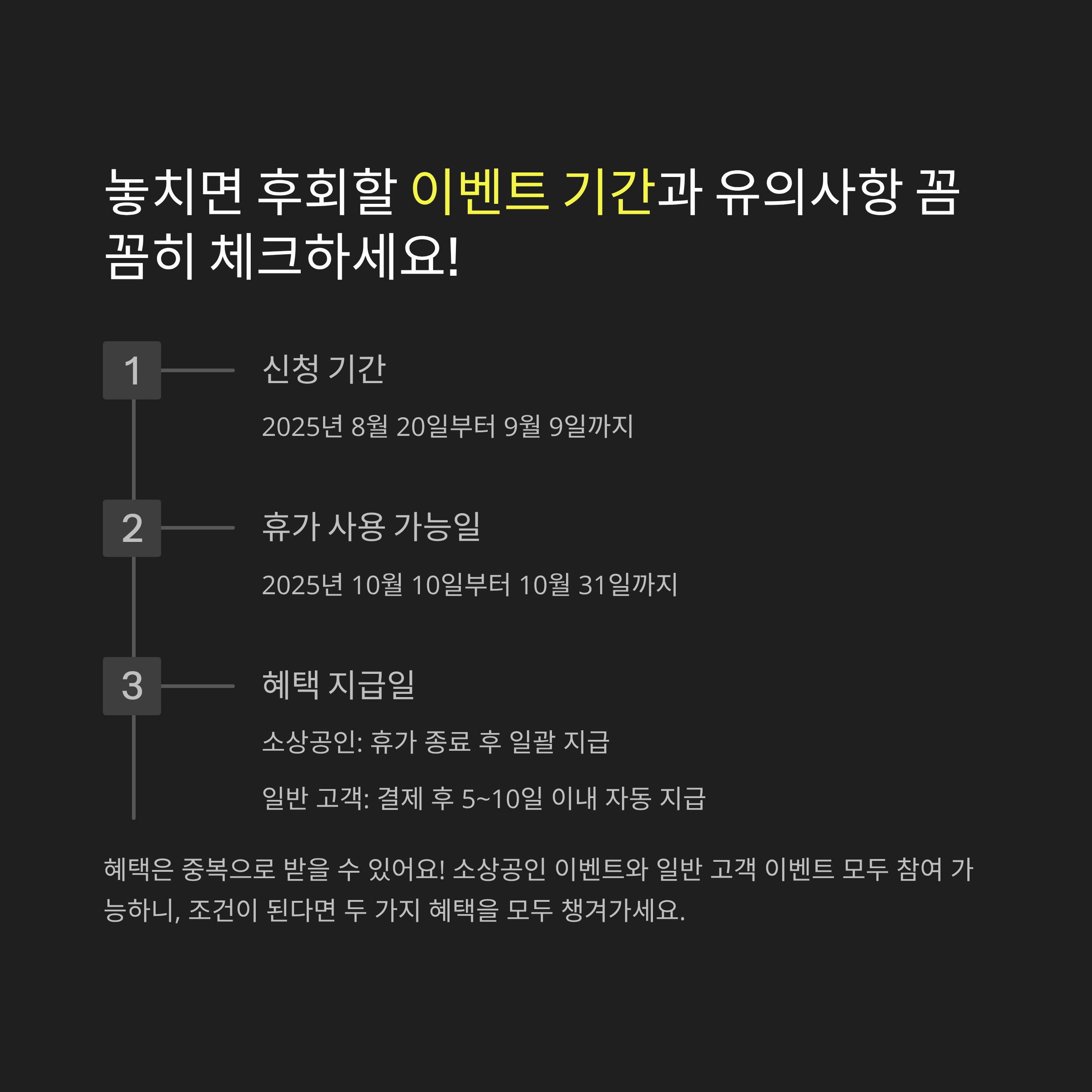 | 혜택 지급일 | 휴가 종료 후(소상공인), 결제 후 5~10일(일반 고객) |