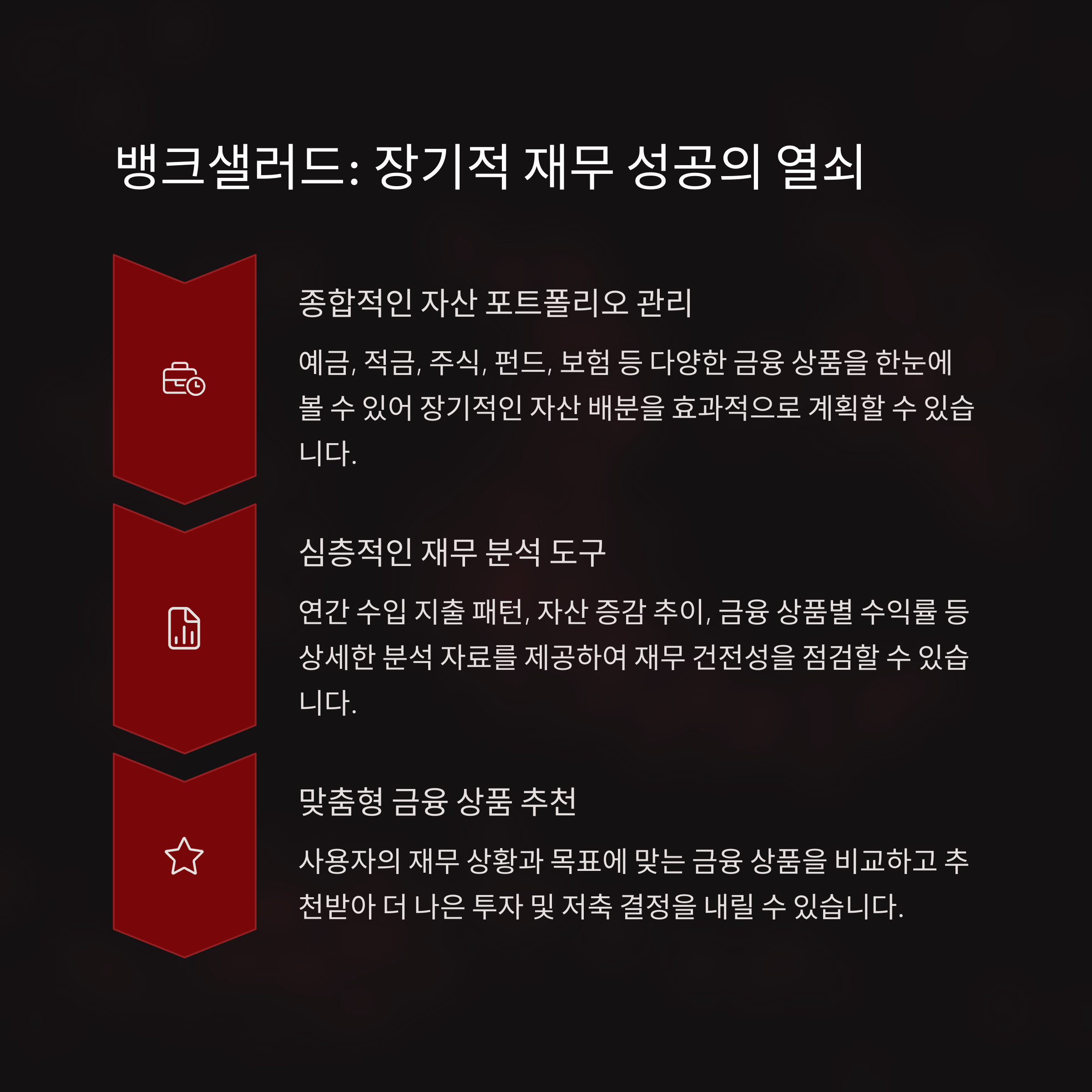 | 뱅크샐러드 장점 | 자산 통합, 월별 소비 분석 및 예산 관리 기능 |