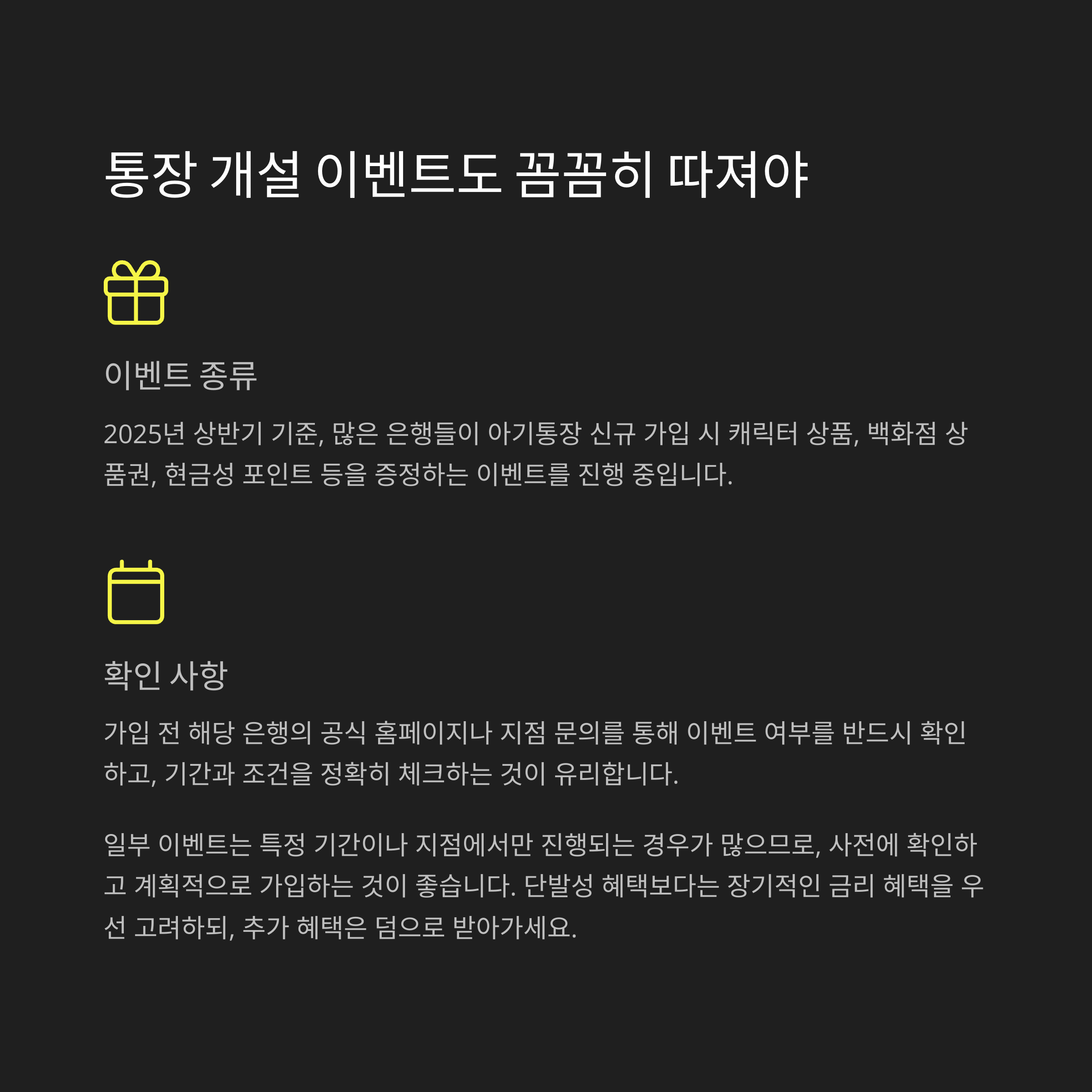 가입 전 해당 은행의 공식 홈페이지나 지점 문의를 통해 이벤트 여부를 반드시 확인하고, 기간과 조건을 정확히 체크하는 것이 유리합니다.