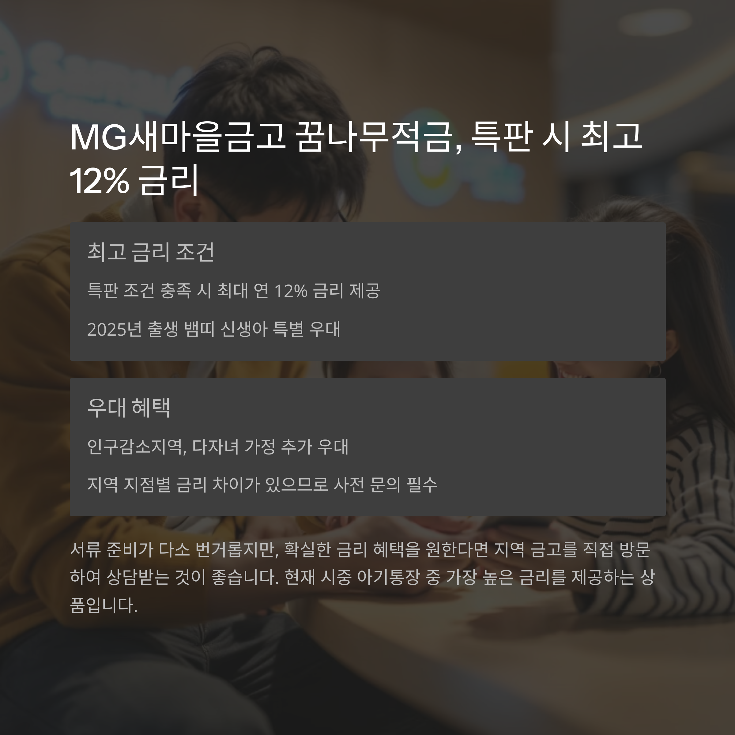 MG새마을금고의 꿈나무적금은 특판 조건에 따라 최고 연 12% 금리를 제공하며, 특히 2025년 출생한 뱀띠 신생아에게 적용됩니다.
