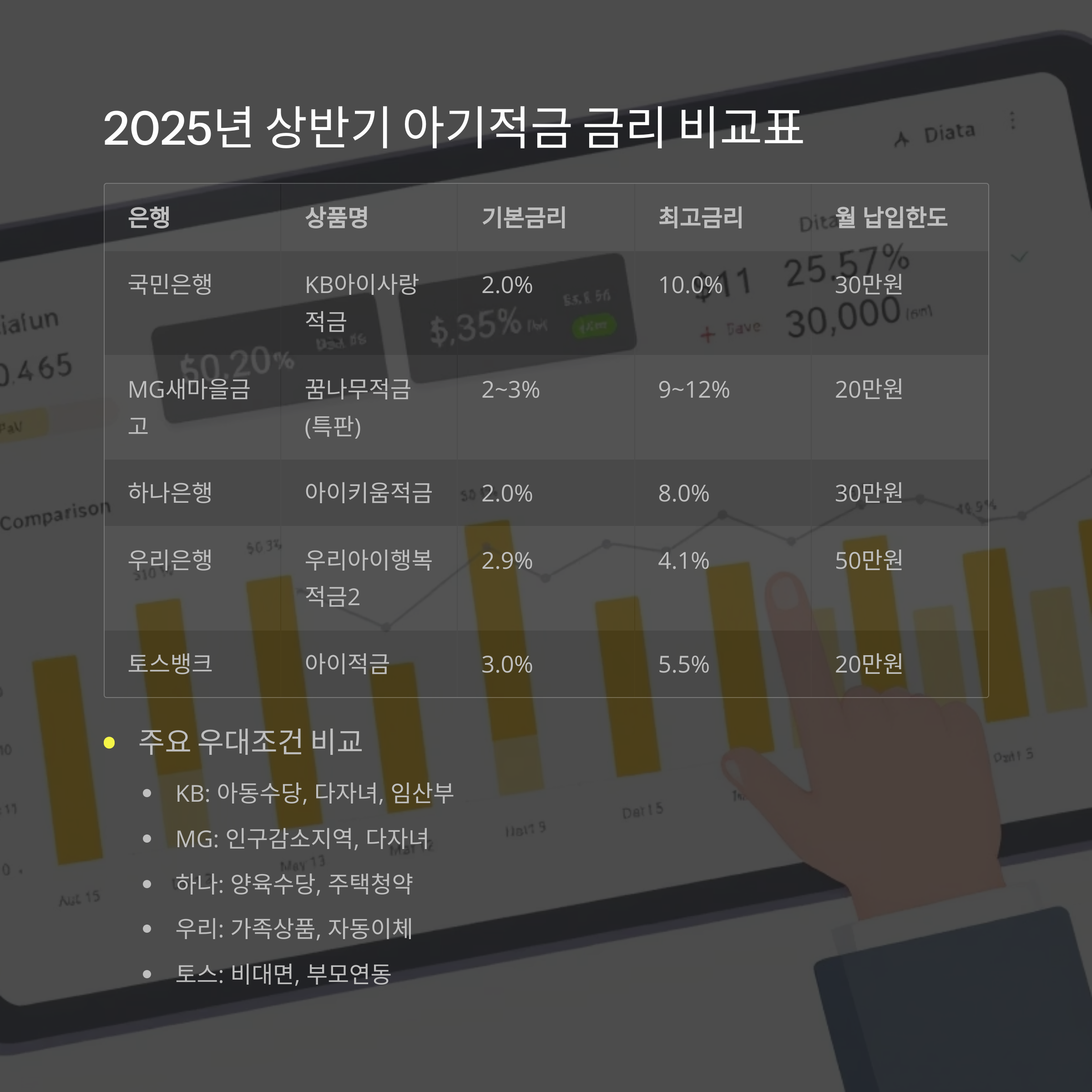이 글에서는 2025년 상반기 기준 인기 아기적금 상품을 금리와 조건 중심으로 비교 분석하며, 가장 유리한 선택 전략을 안내해드립니다.