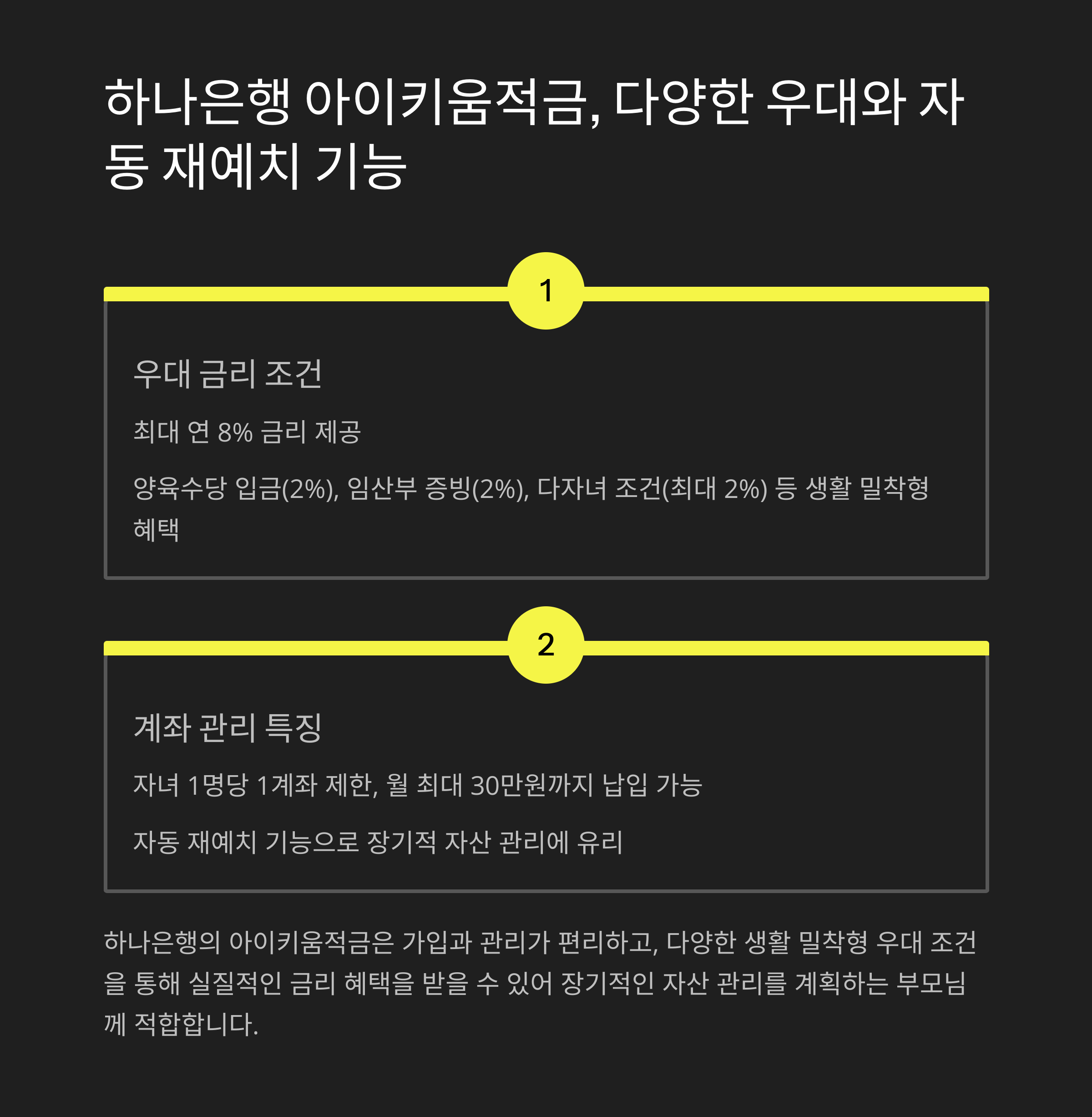 하나은행의 '아이키움적금'은 최대 연 8% 금리를 제공하며, 양육수당 입금(2%), 임산부 증빙(2%), 다자녀 조건(최대 2%) 등 다양한 생활 밀착형 우대 조건이 마련되어 있습니다.