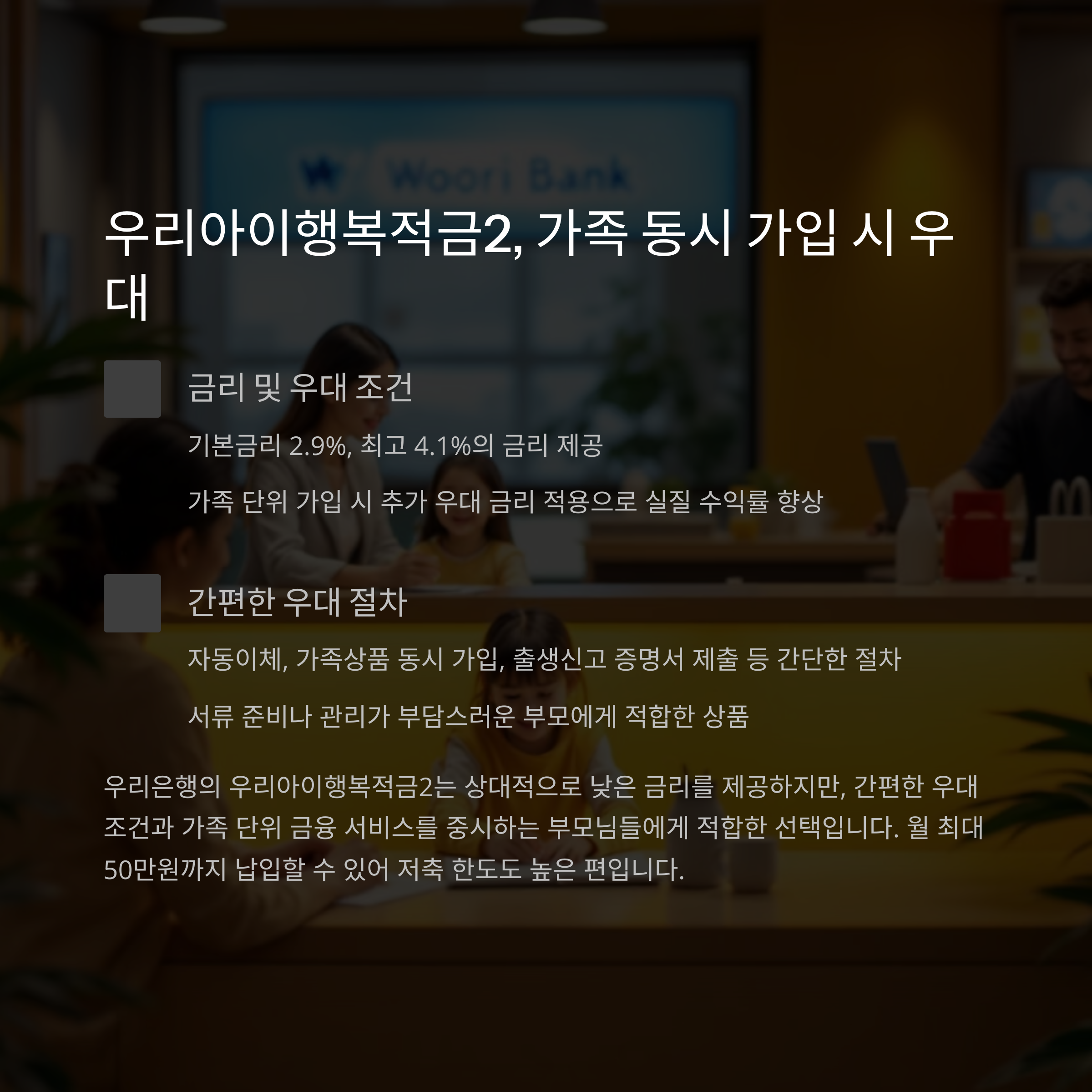 우리은행의 '우리아이행복적금2'는 기본금리 2.9%, 최고 4.1%의 비교적 낮은 금리를 제공하지만, 가족 단위 가입 시 우대 조건이 적용되어 실질 수익률을 높일 수 있습니다.