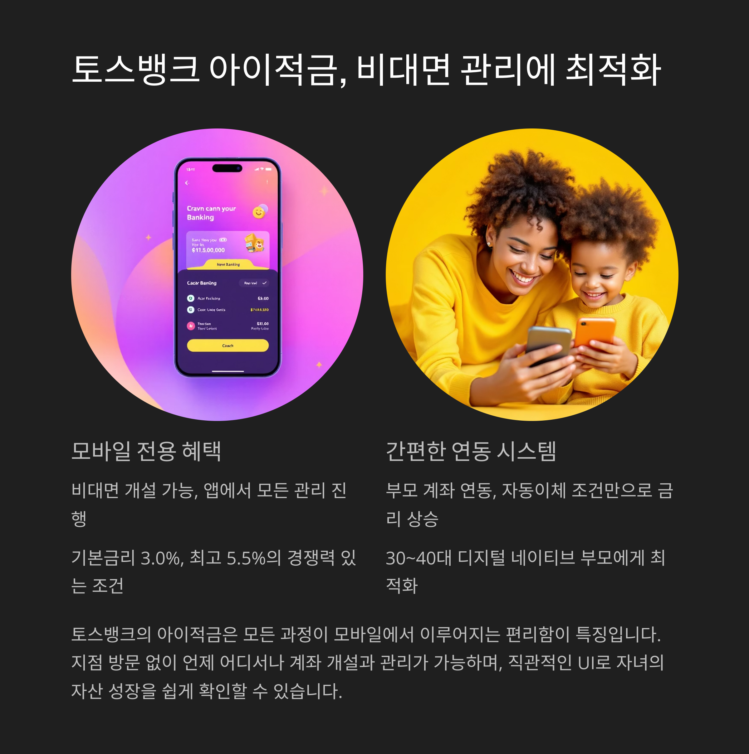 특히 모바일 중심 금융 관리에 익숙한 30~40대 부모들에게 가장 적합한 상품으로 평가받고 있습니다.