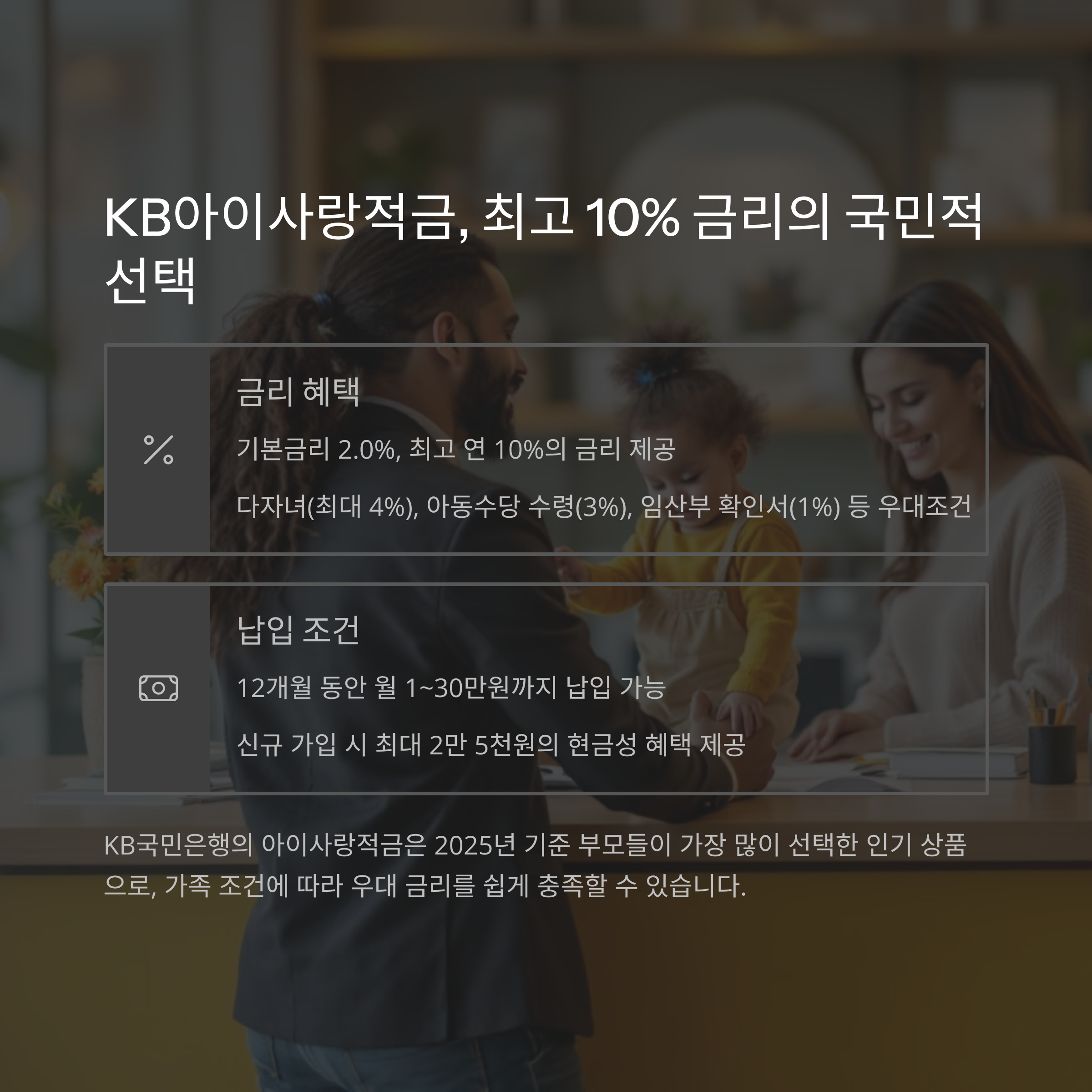 KB국민은행의 '아이사랑적금'은 2025년 기준 최고 연 10%의 금리를 제공하며 부모들이 가장 많이 선택한 상품입니다.
