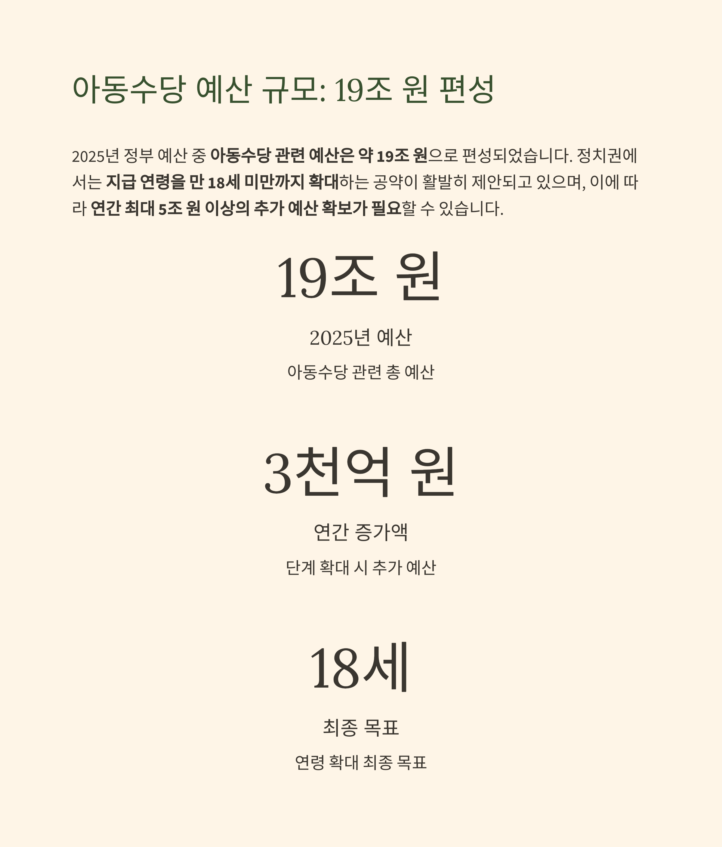 | 예산 규모 | 2025년 약 19조 원, 단계적 확대 시 매년 3천억 원 증가 |