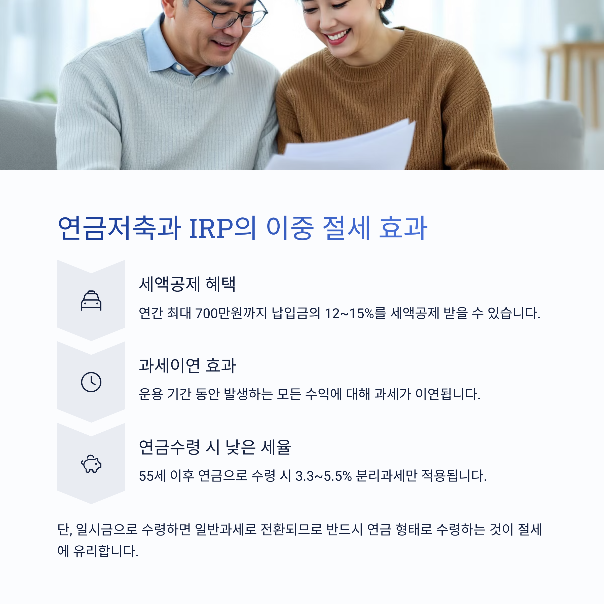 연금저축과 IRP는 연간 최대 700만 원까지 세액공제 혜택을 받을 수 있으며, 운용 수익에 대해서는 과세가 이연됩니다.
