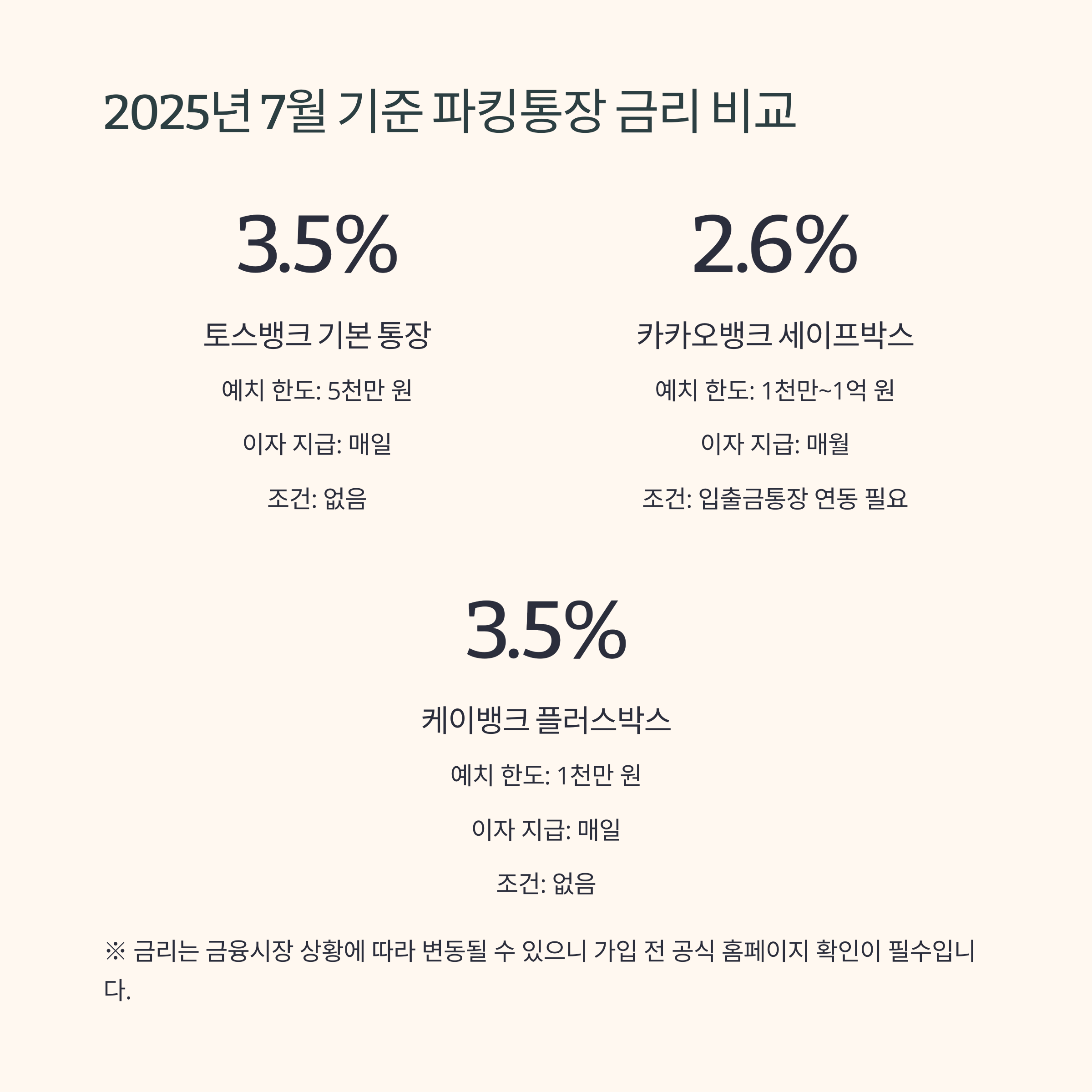 아래 표는 2025년 6~7월 기준 각 은행의 파킹통장 조건을