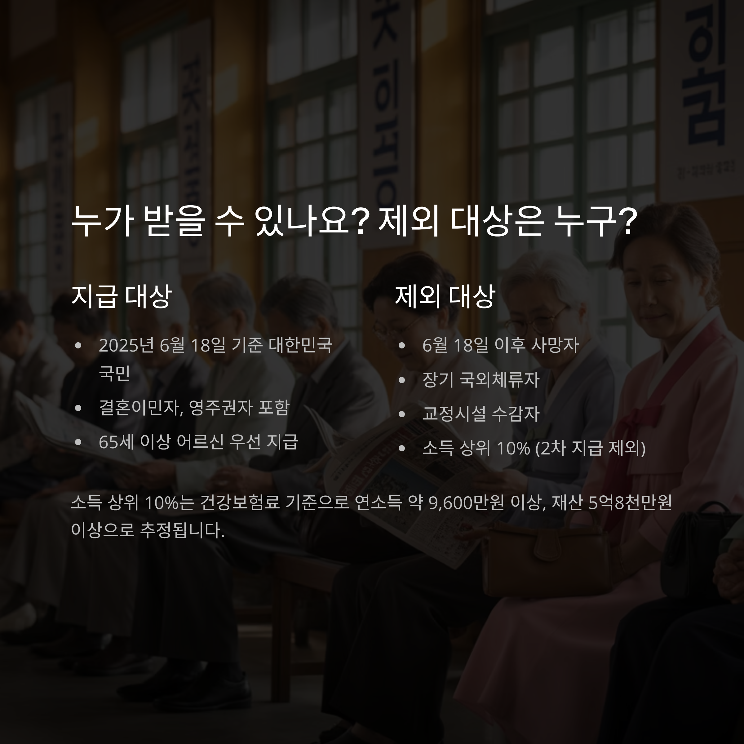 지급 대상은 2025년 6월 18일 기준 주민등록상 대한민국 국민 전체이며,