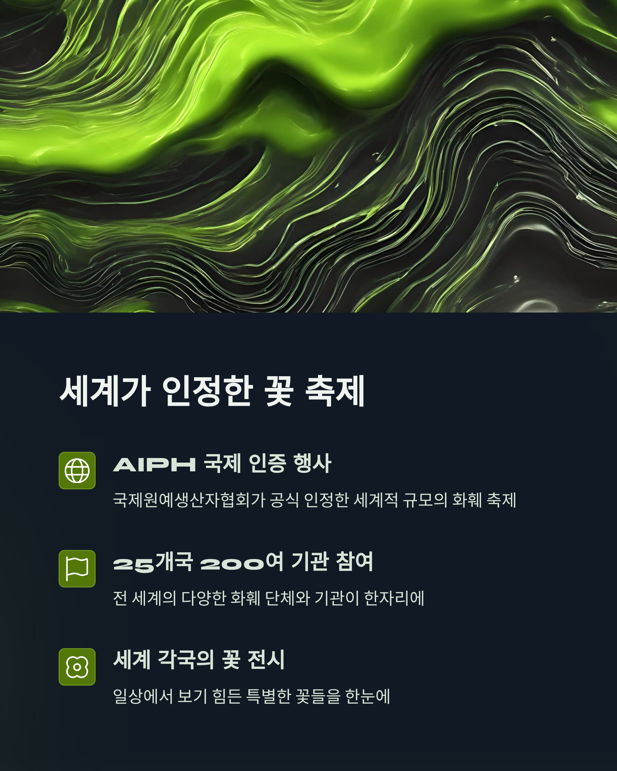 | AIPH 인증, 25개국 200여 단체 참여 | 화훼예술경연, 산업컨퍼런스, 해외바이어 초청 | 고양시민권, 우대권 별도 운영 (8,000원~12,000원) |