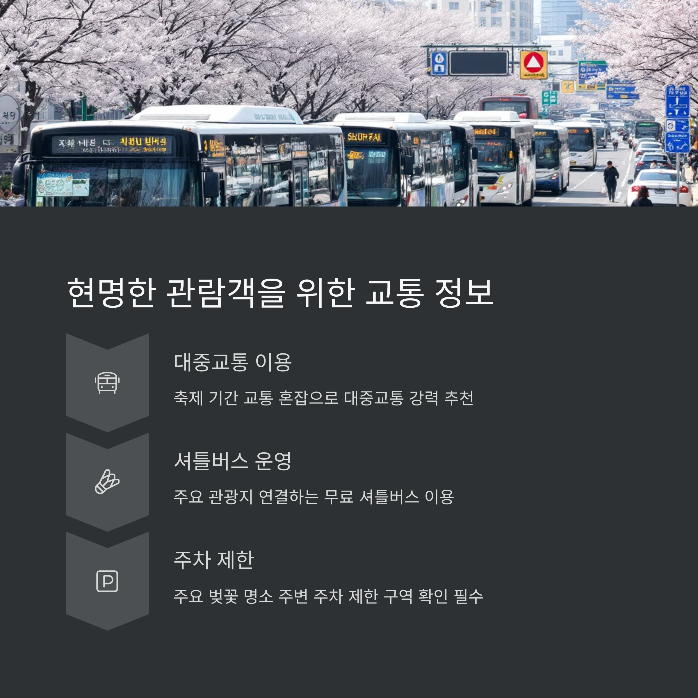 | 여좌천, 경화역 등 사진 명소는 주말 붐빔 | 야경, 체험 부스, 벚꽃터널 산책 등 | 벚꽃 개화정보는 기상청 등에서 실시간 확인 |