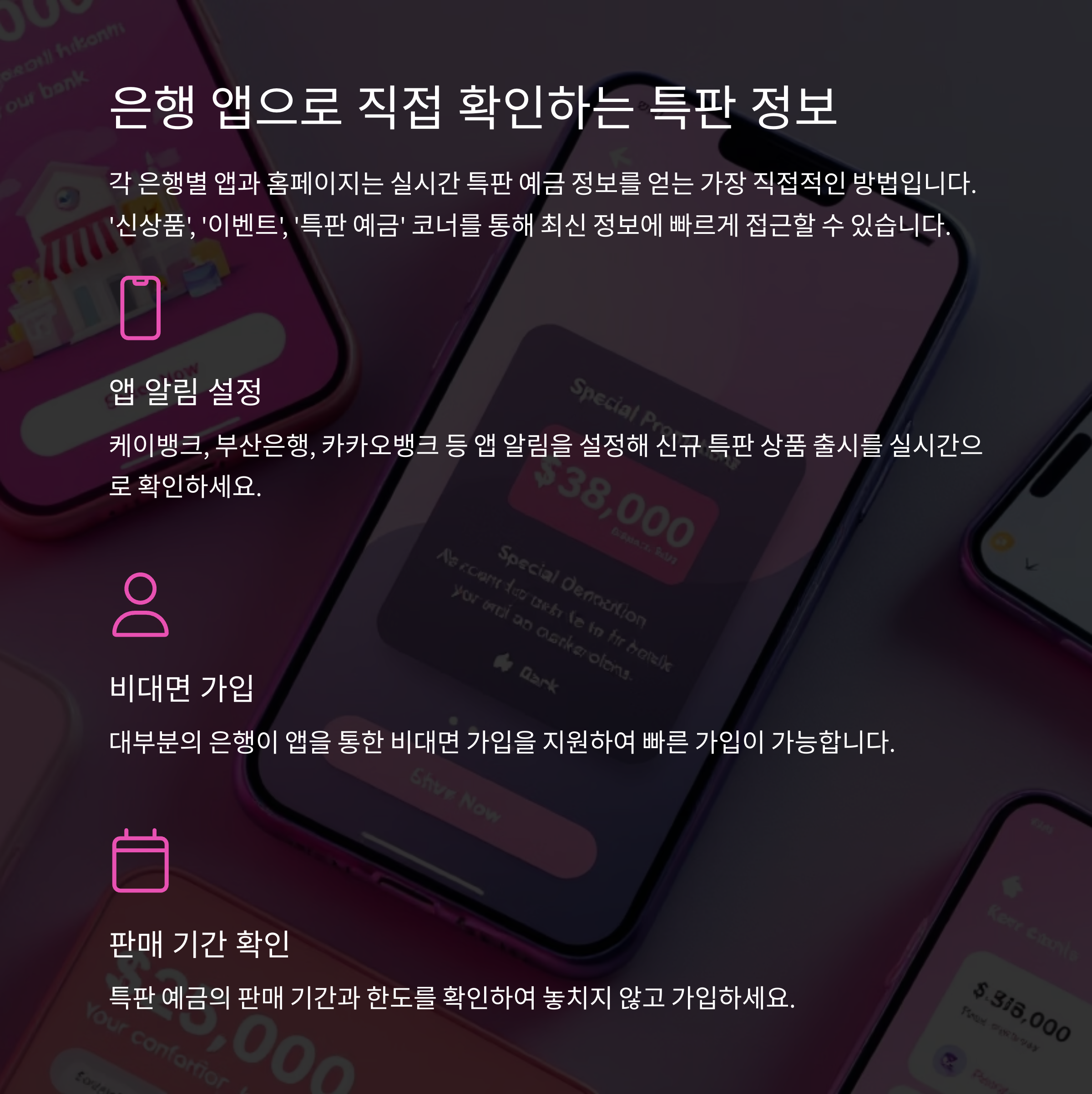 특히 케이뱅크, 부산은행, 카카오뱅크 등은 비대면 가입 특판 상품을 자주 출시하므로 앱 알림 기능을 설정해두는 것이 효과적입니다.