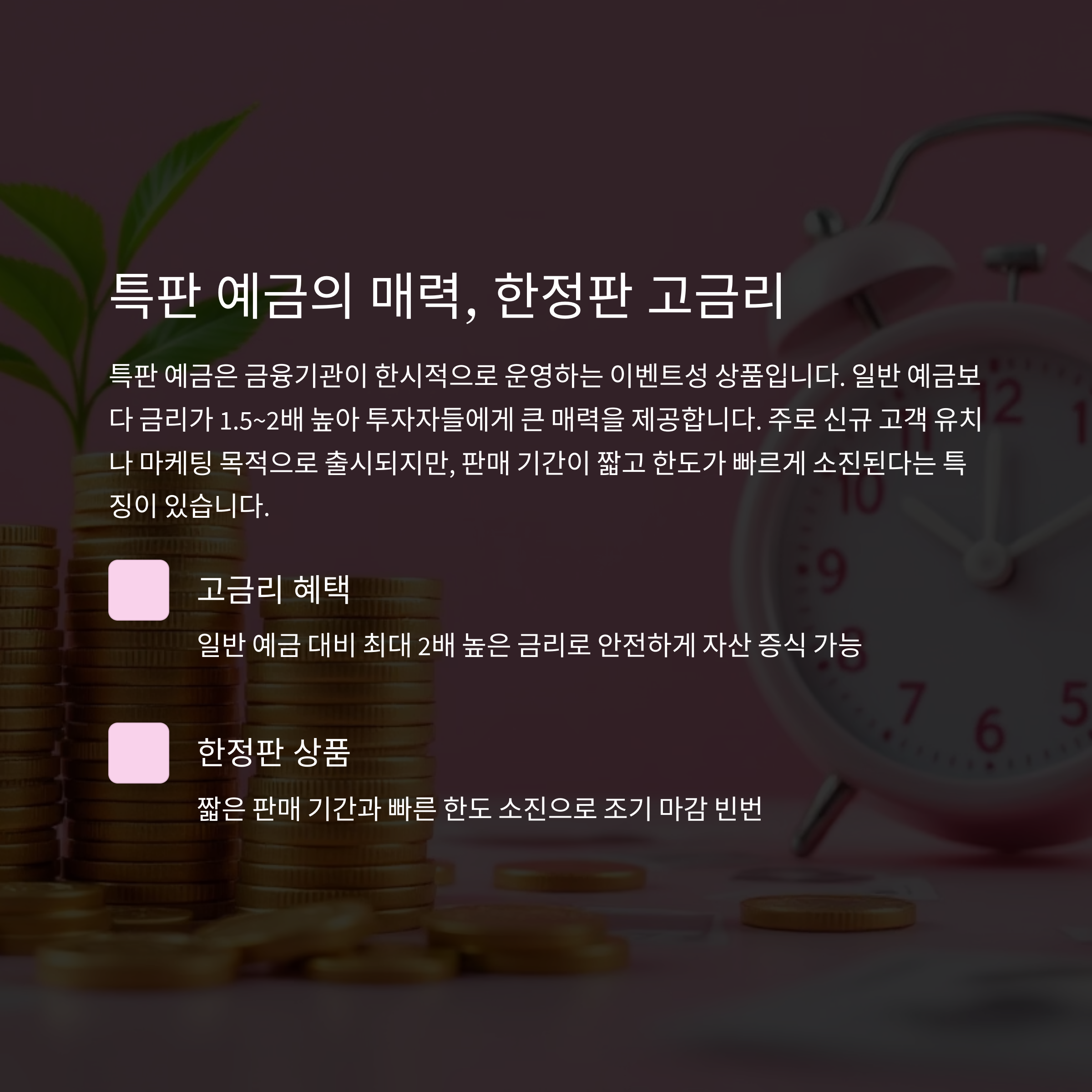 특판 예금은 금융기관이 한시적으로 고금리로 운영하는 이벤트성 상품입니다.