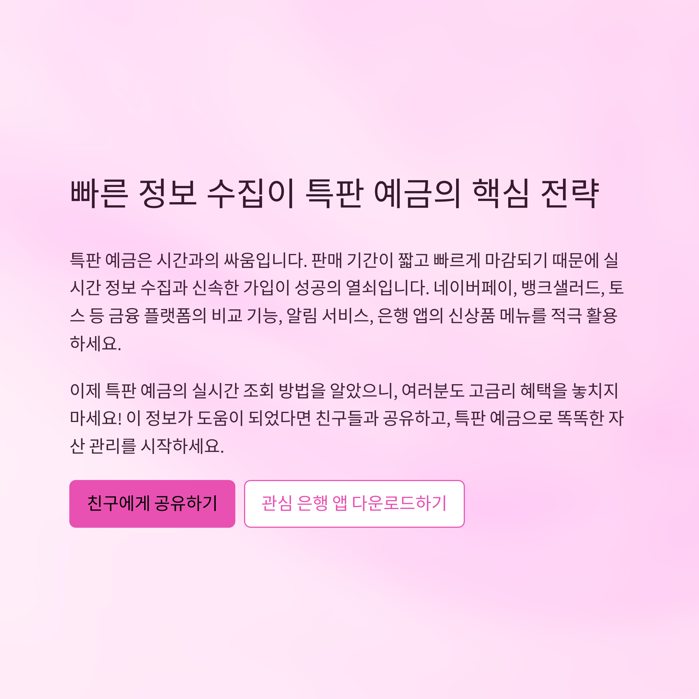 이번 글에서는 특판 예금을 가장 빠르고 정확하게 찾는 실시간 조회 방법과 주요 특판 상품 정보를 정리해드립니다.