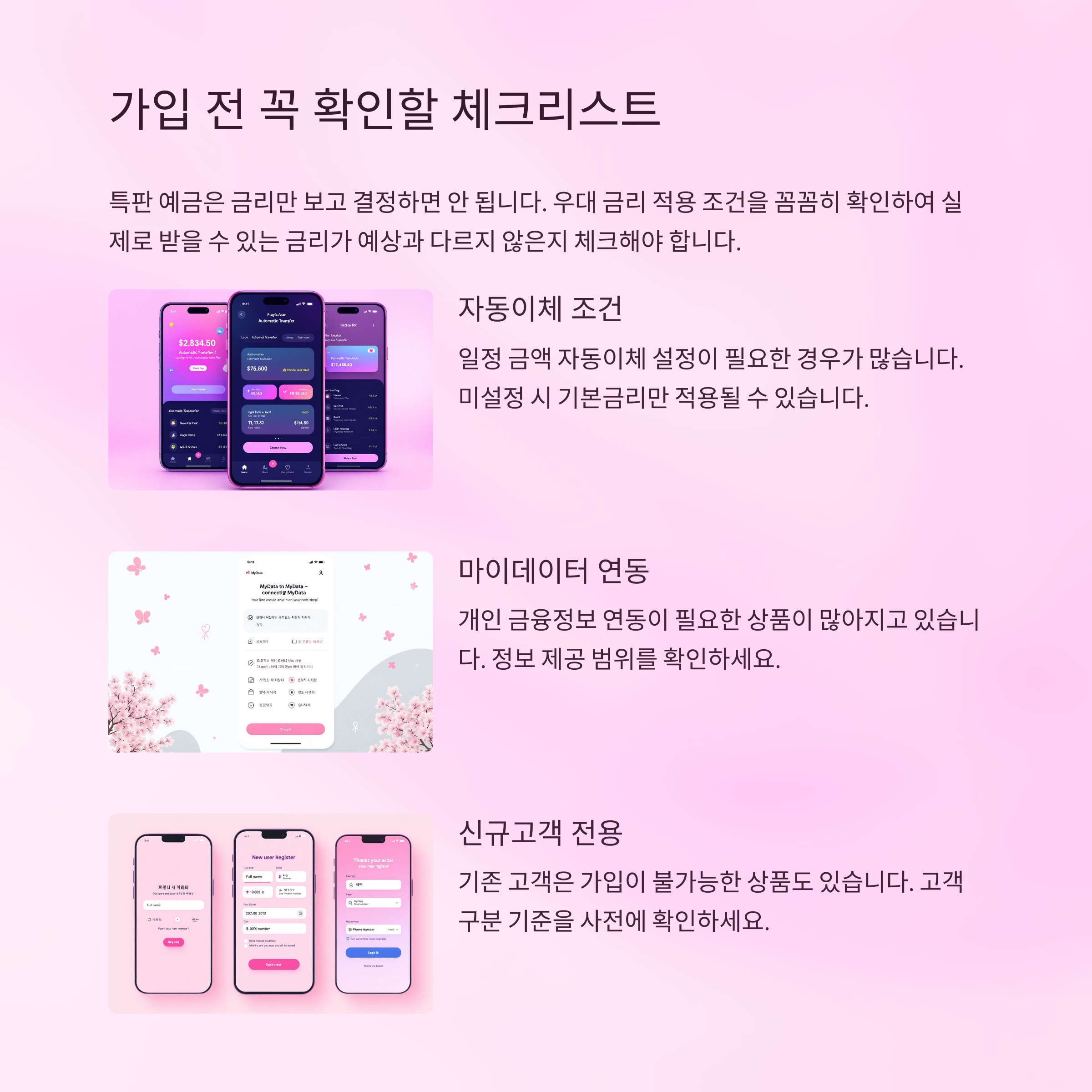 자동이체, 마이데이터 연동, 신규고객 조건 등 우대이율 적용 조건이 붙는 경우가 많아 가입 전 조건 확인은 필수입니다.