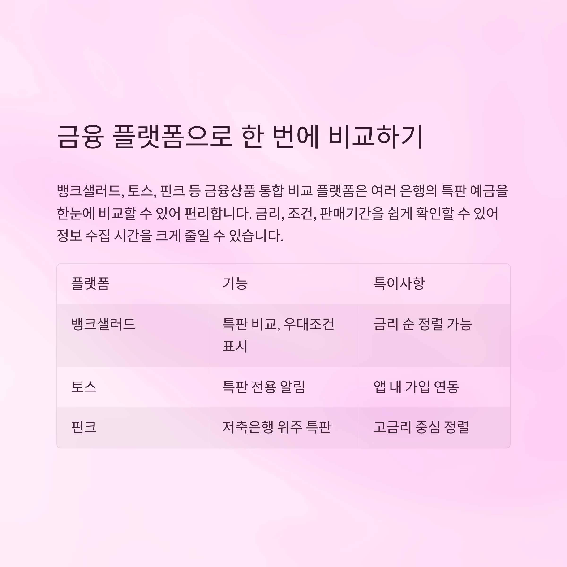금융상품 통합 비교 플랫폼인 뱅크샐러드, 토스, 핀크 등은 여러 은행의 특판 예금을 한 번에 비교할 수 있는 시스템을 갖추고 있습니다.