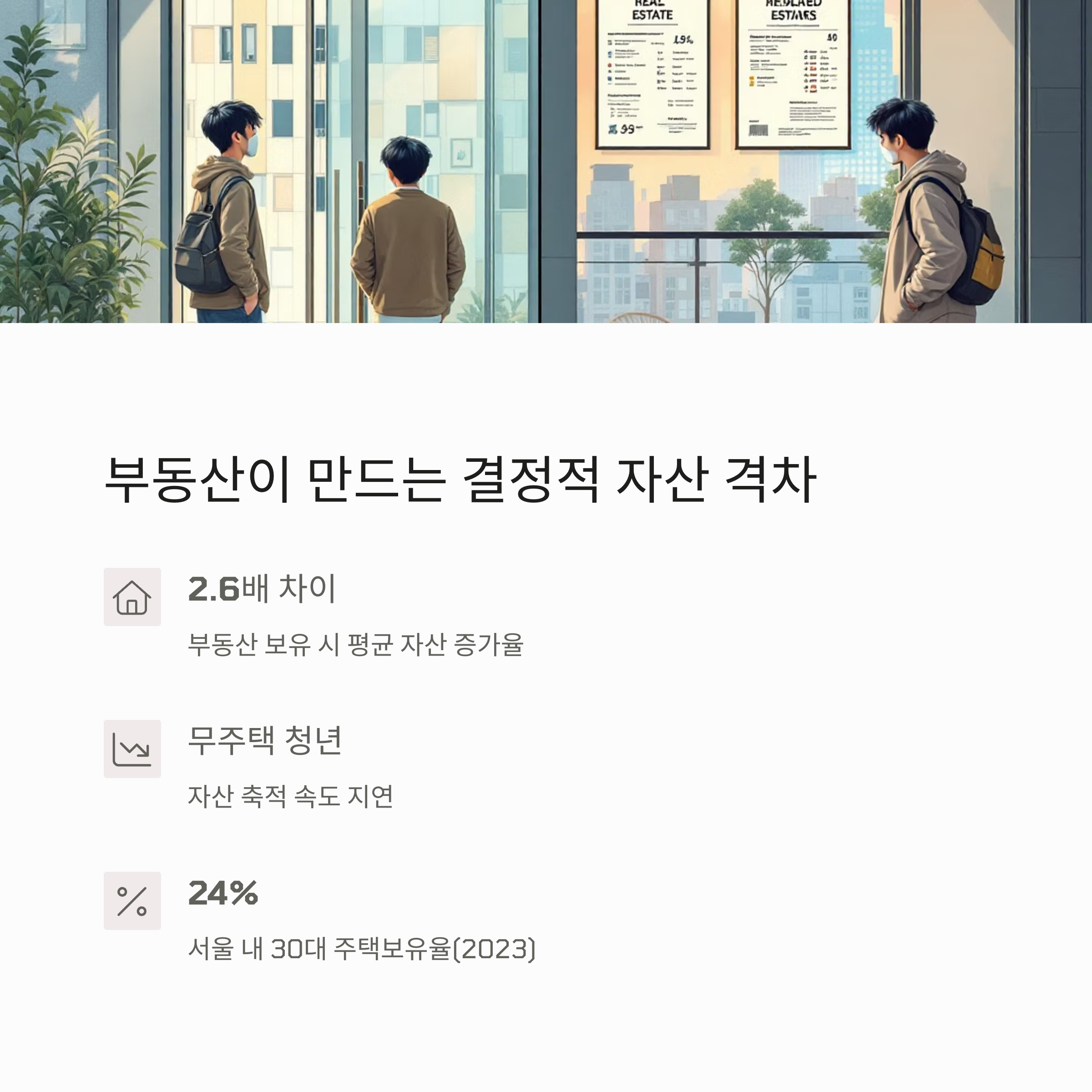 | 전체 평균(1억 원)보다 낮은 수준 | 저축 중심에서 투자 중심으로 이동 | 부동산 보유 여부가 큰 변수 |
