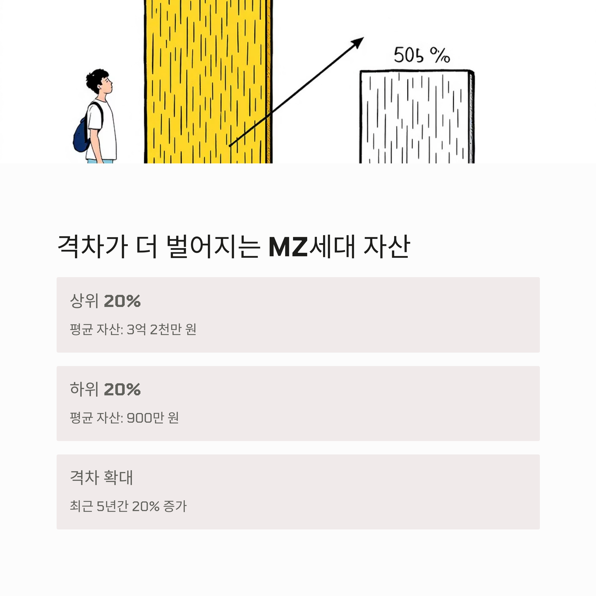 | 2030세대 평균 약 5천만~7천만 원 | 밀레니얼 27.6%, Z세대 21.4% | 상위 20%와 하위 20%의 격차 35배 |