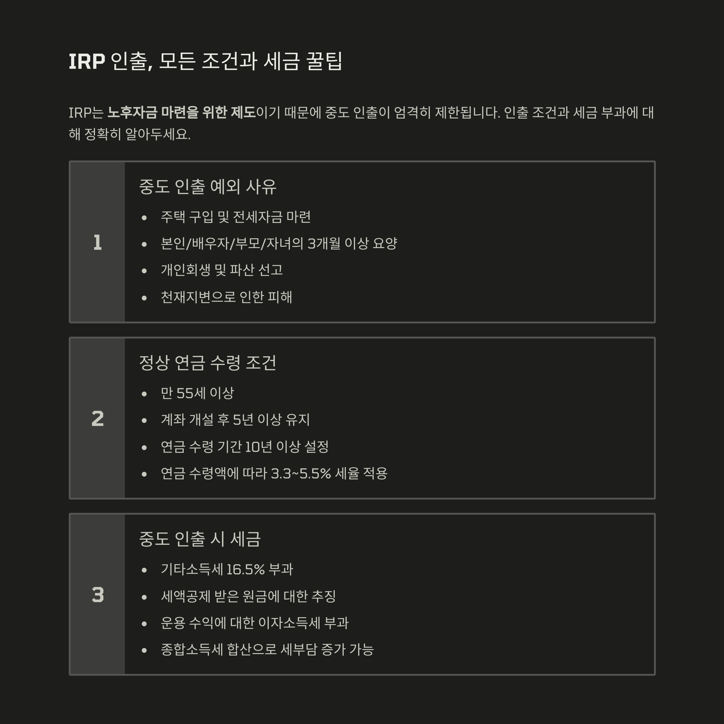 IRP는 노후자금 마련을 위한 제도인 만큼 중도 인출이 엄격히 제한됩니다.