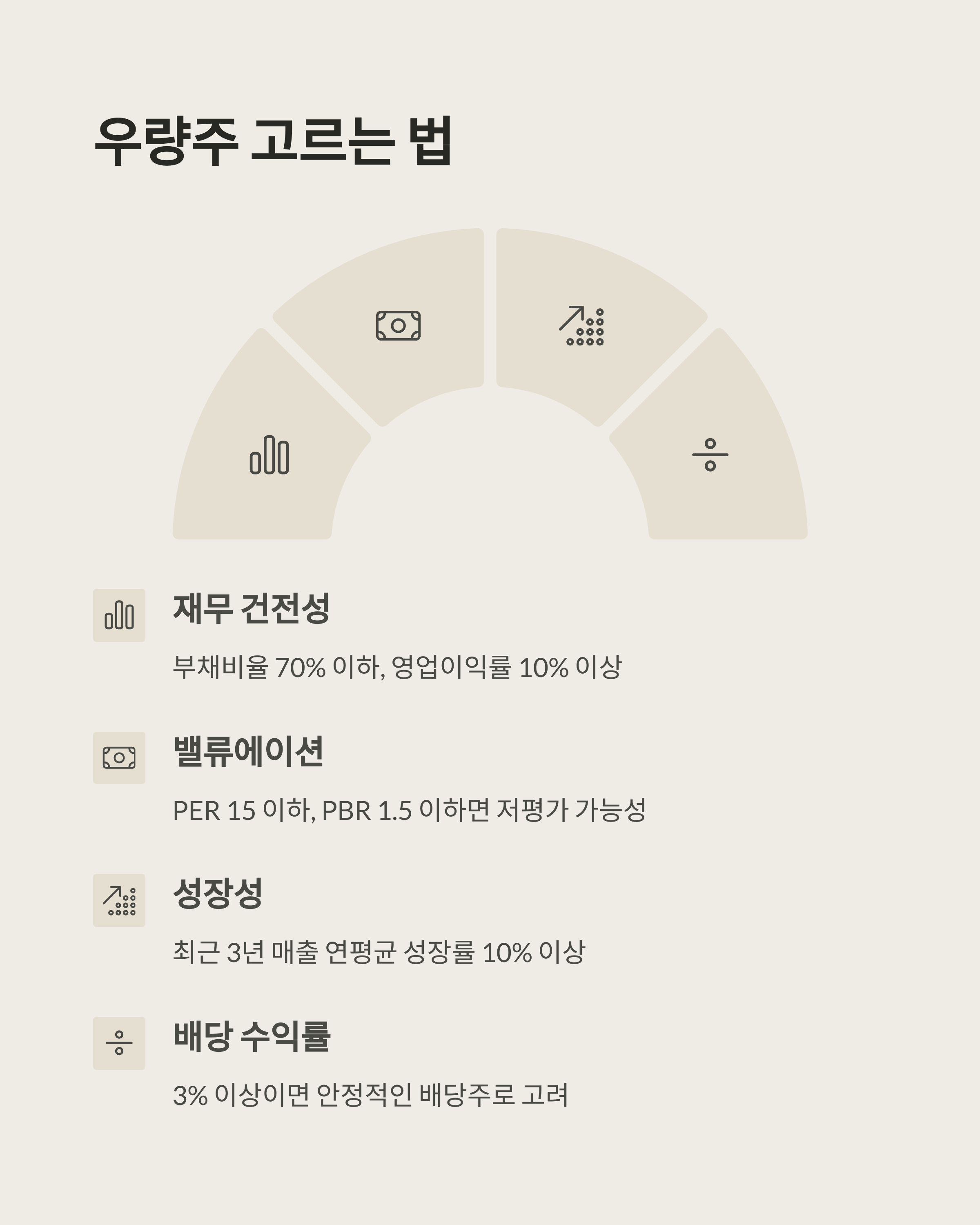 | 우량주 투자 | 안정성 높은 대형주부터 시작 추천 |