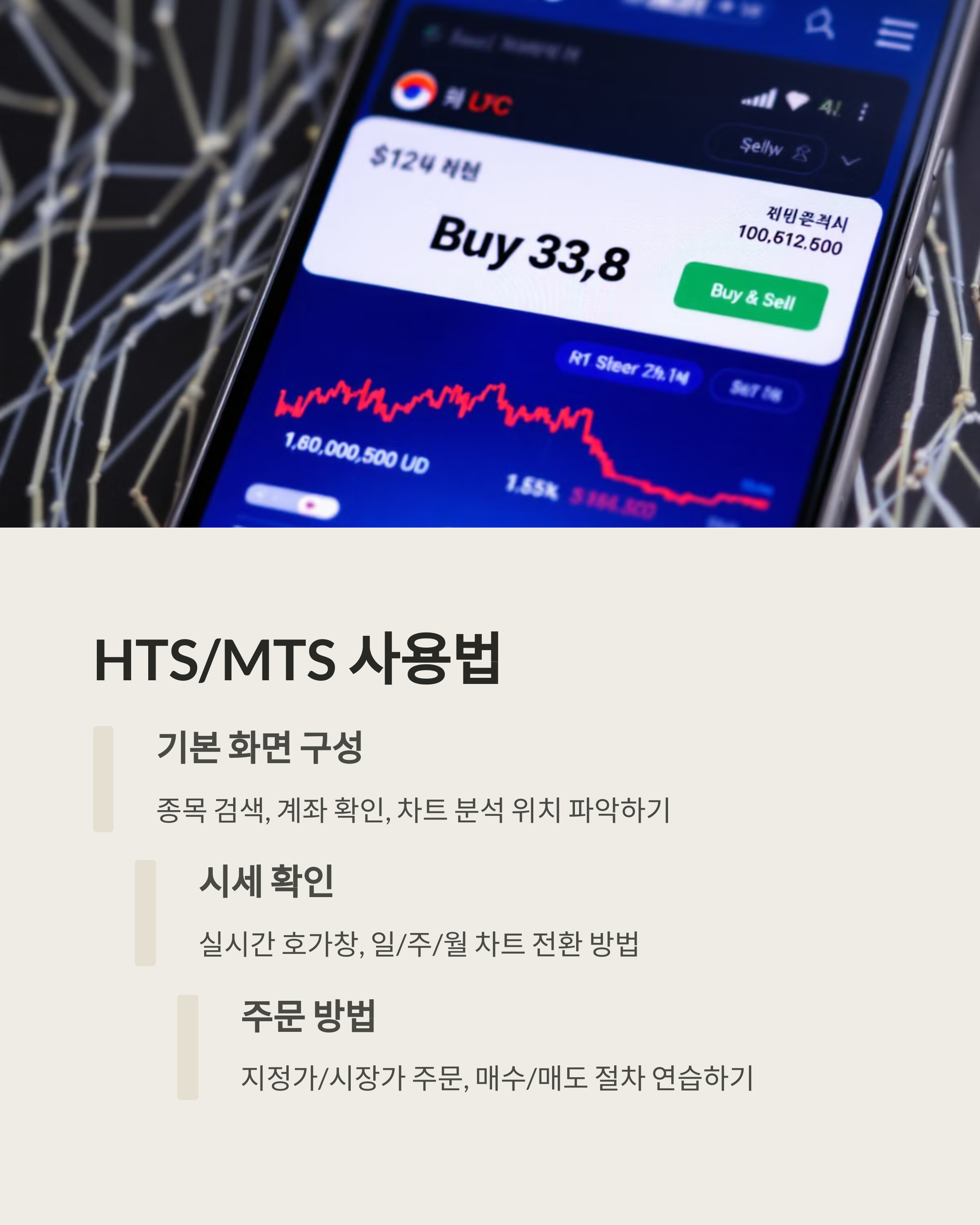 HTS와 MTS는 주식 거래에 있어 필수 도구입니다. 실시간 시세 확인부터 매수, 매도, 차트 분석까지 다양한 기능을 제공하며, 앱 인터페이스에 익숙해지는 것이 중요합니다. 특히 초보자라면 키움증권, 미래에셋증권 등 사용이 간편한 앱부터 시작하는 것이 좋습니다. 또한 우량주에 소액 투자하고, 다양한 업종에 분산 투자하는 전략을 통해 리스크를 줄이는 것이 안전한 투자 방법입니다.