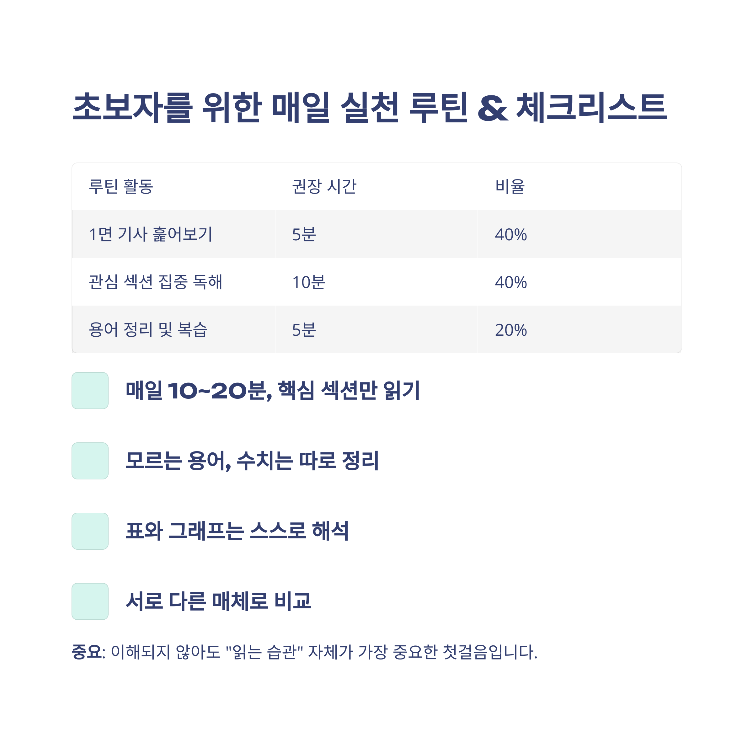 매일 10분이라도 꾸준히 제목, 데이터 중심으로 읽는 습관이 실력의 핵심입니다.