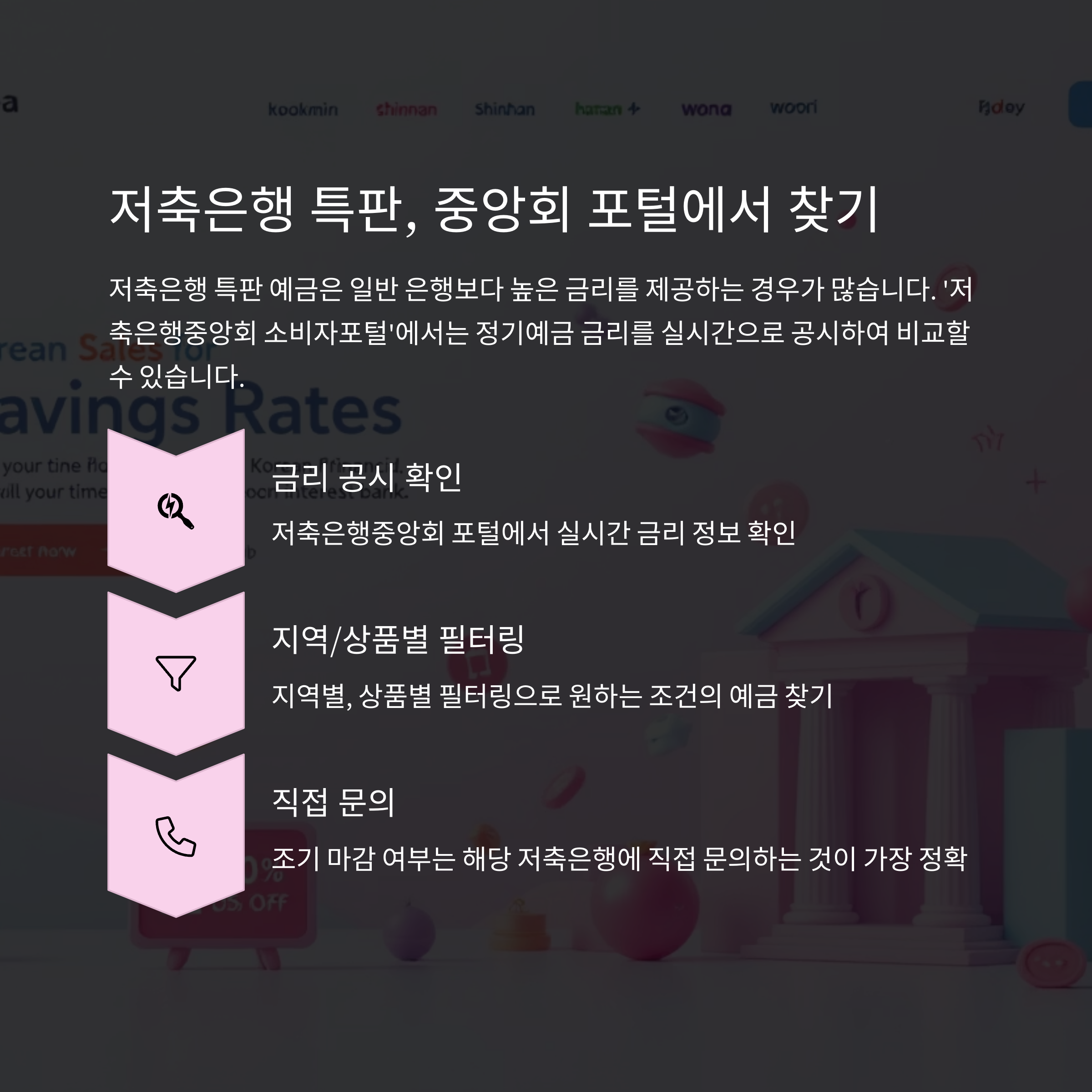 저축은행 특판 예금 정보는 '저축은행중앙회 소비자포털'에서 정기예금 금리를 실시간 공시합니다.