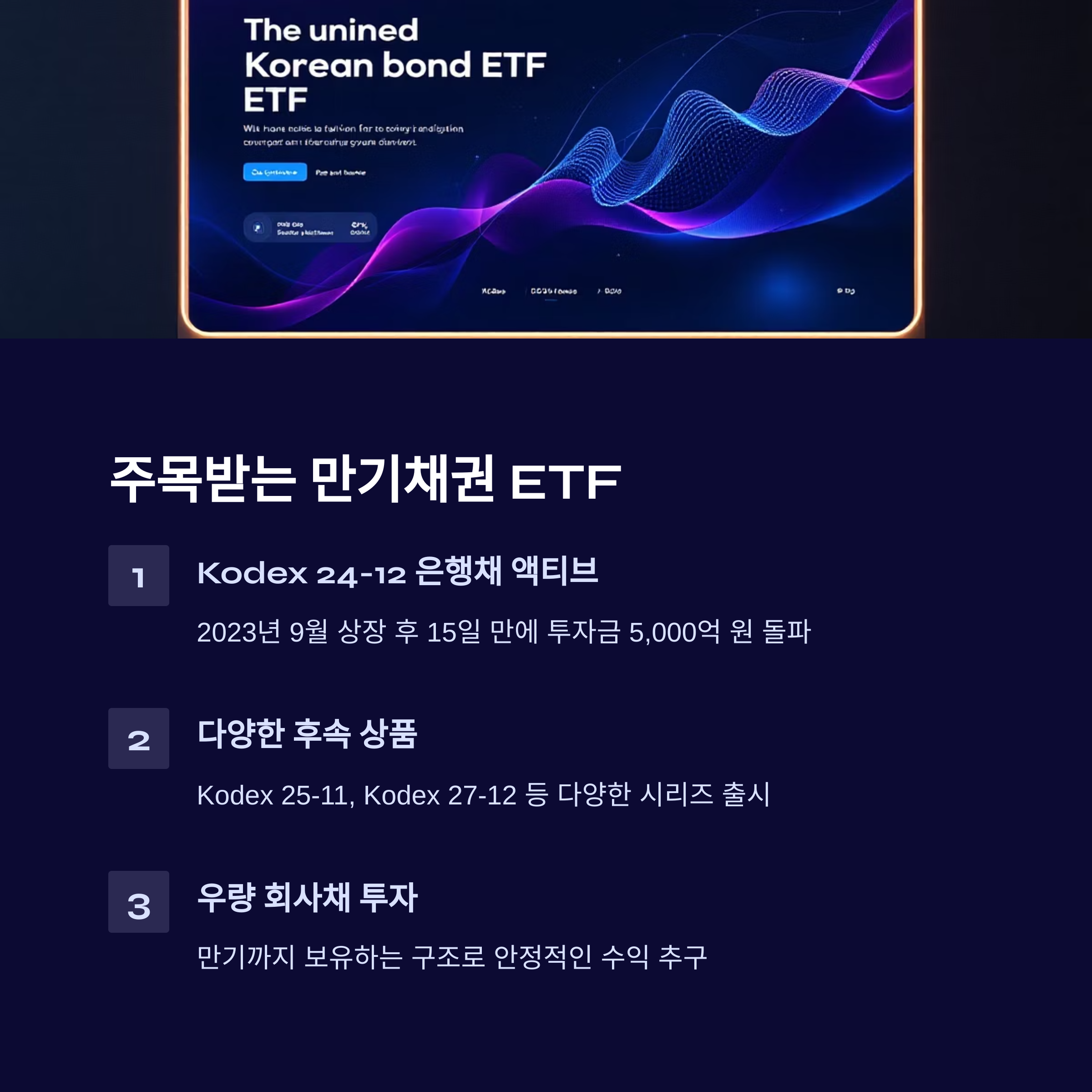 2023년 9월 상장 후 단 15일 만에 투자금 5,000억 원을 돌파했으며, 이후 Kodex 25-11, Kodex 27-12 등 다양한 시리즈가 출시되었습니다.