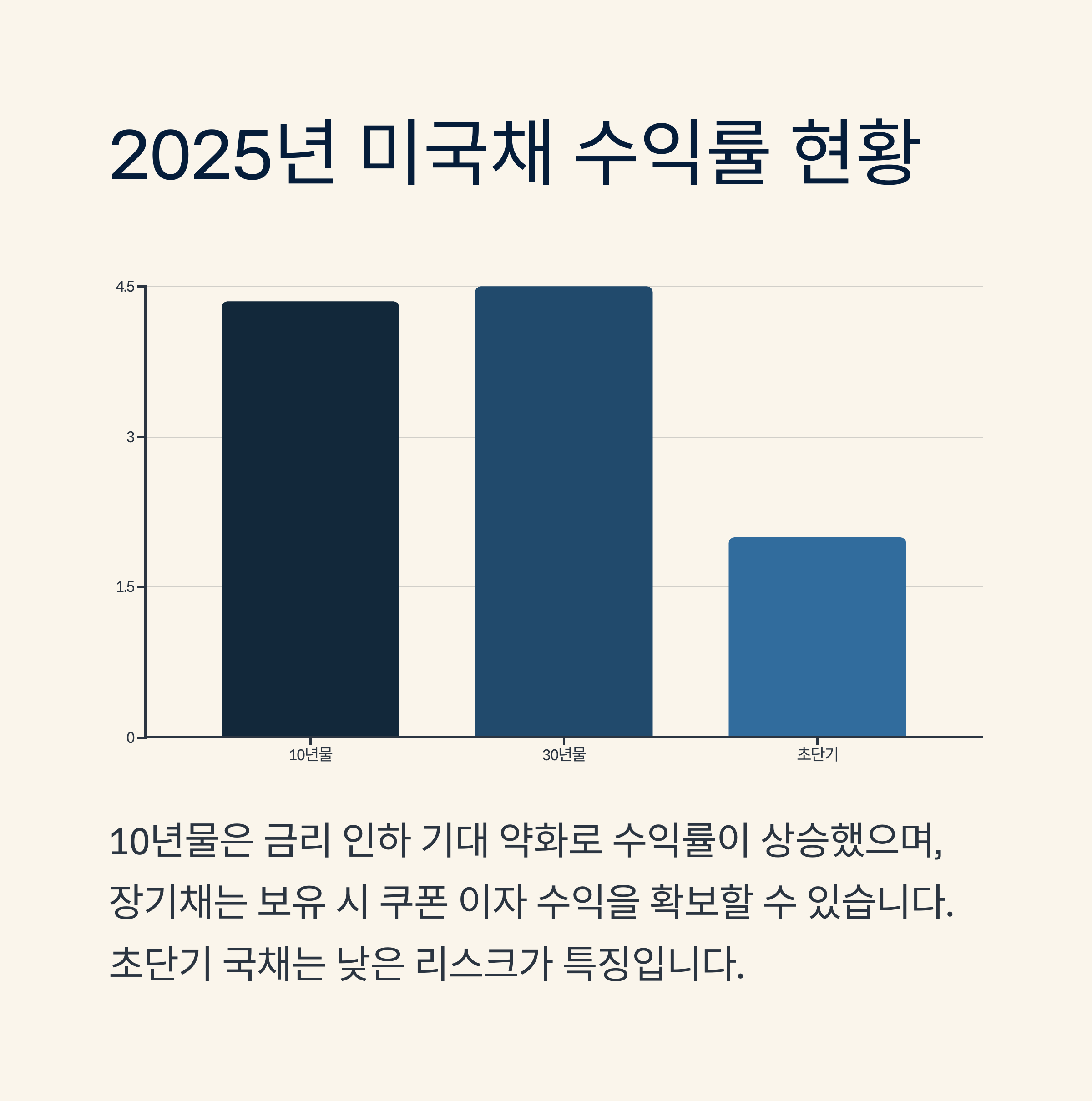 현재처럼 고금리 기조가 지속될 경우에도 미국채 ETF는 연 4~5% 수준의 이자 수익과 함께 자본차익 기대를 동시에 충족시킬 수 있는 안정적 자산군입니다.