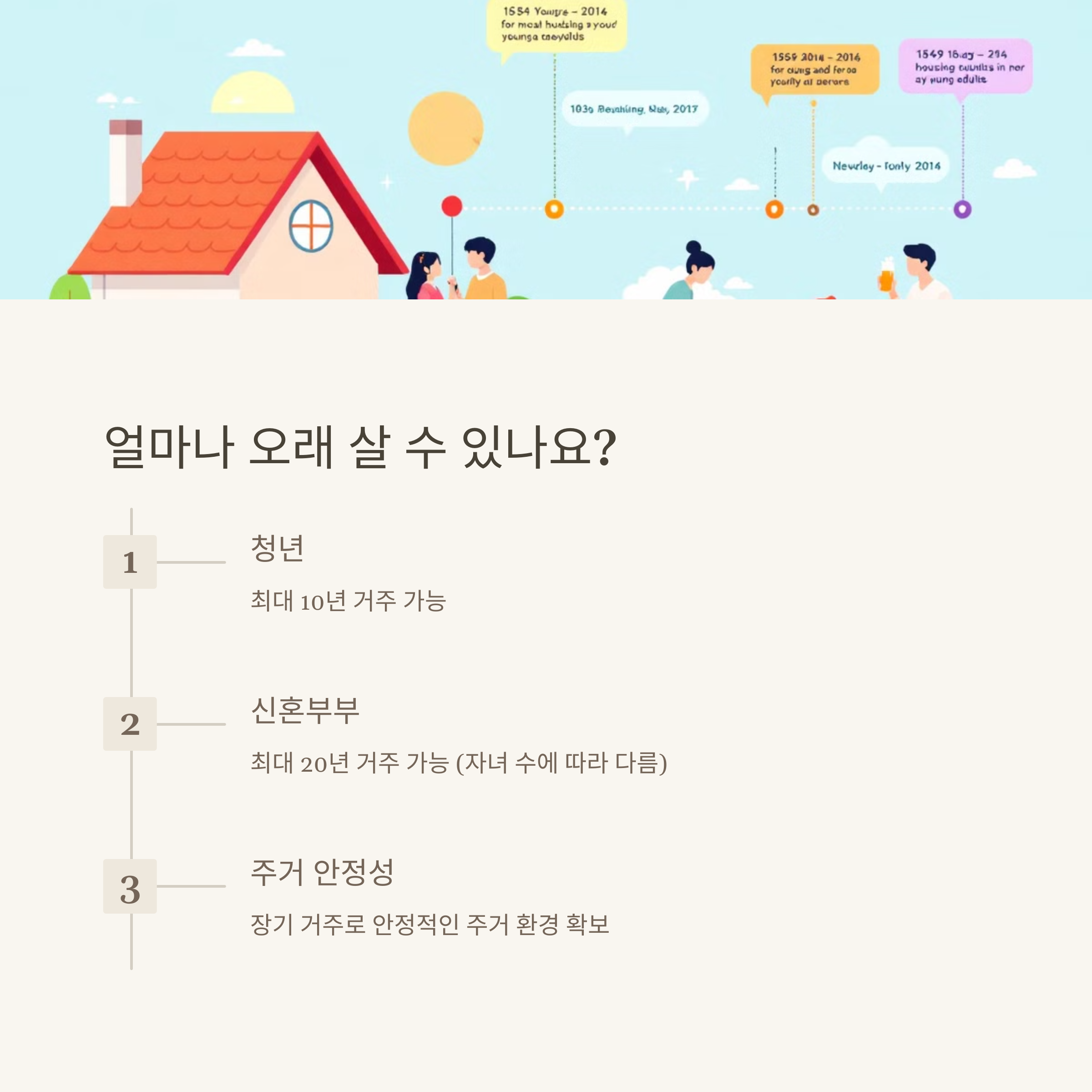 | 19~39세 청년 대상, 최대 10년 거주 가능 | 결혼 7년 이내 부부, 시세 30~40% 임대료 | 시세 70~80% 임대료, 자녀 시 최대 14년 가능 |